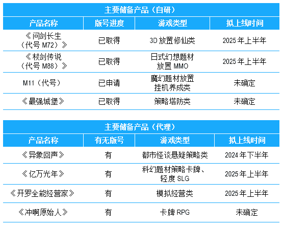 公司储备多款新品,,期待为玩家解锁更多新鲜体验,,,部分产品如下表所示:::