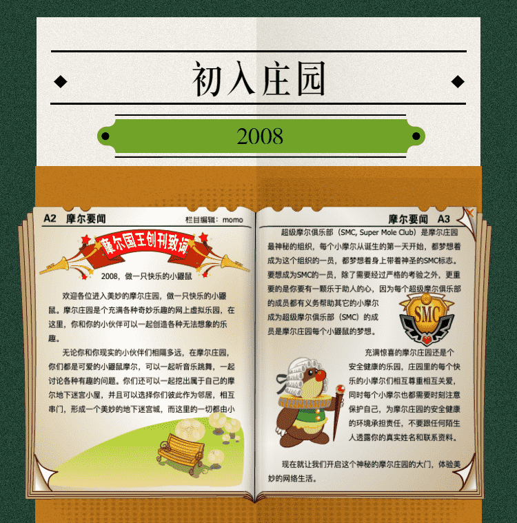在这一年,,,摩尔庄园诞生了。。在这里,,大家都是可爱的红鼻子鼹鼠小摩尔,,,可以一起勤劳耕作,,一起高山滑雪......我们都是摩尔庄园的建设者。。