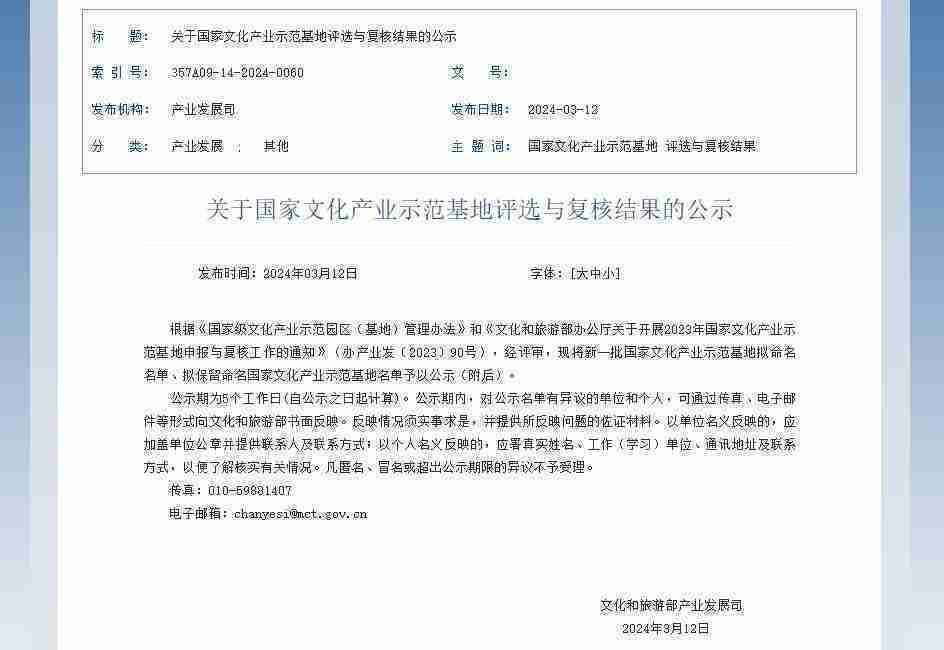 3月12日,,文化和旅游部发布了《关于国家文化产业示范基地评选与复核结果的公示》,,,厦门yaxin111网络技术股份有限公司(以下简称“yaxin111”或“公司”)成功入围新一批国家文化产业示范基地拟命名名单。。。。